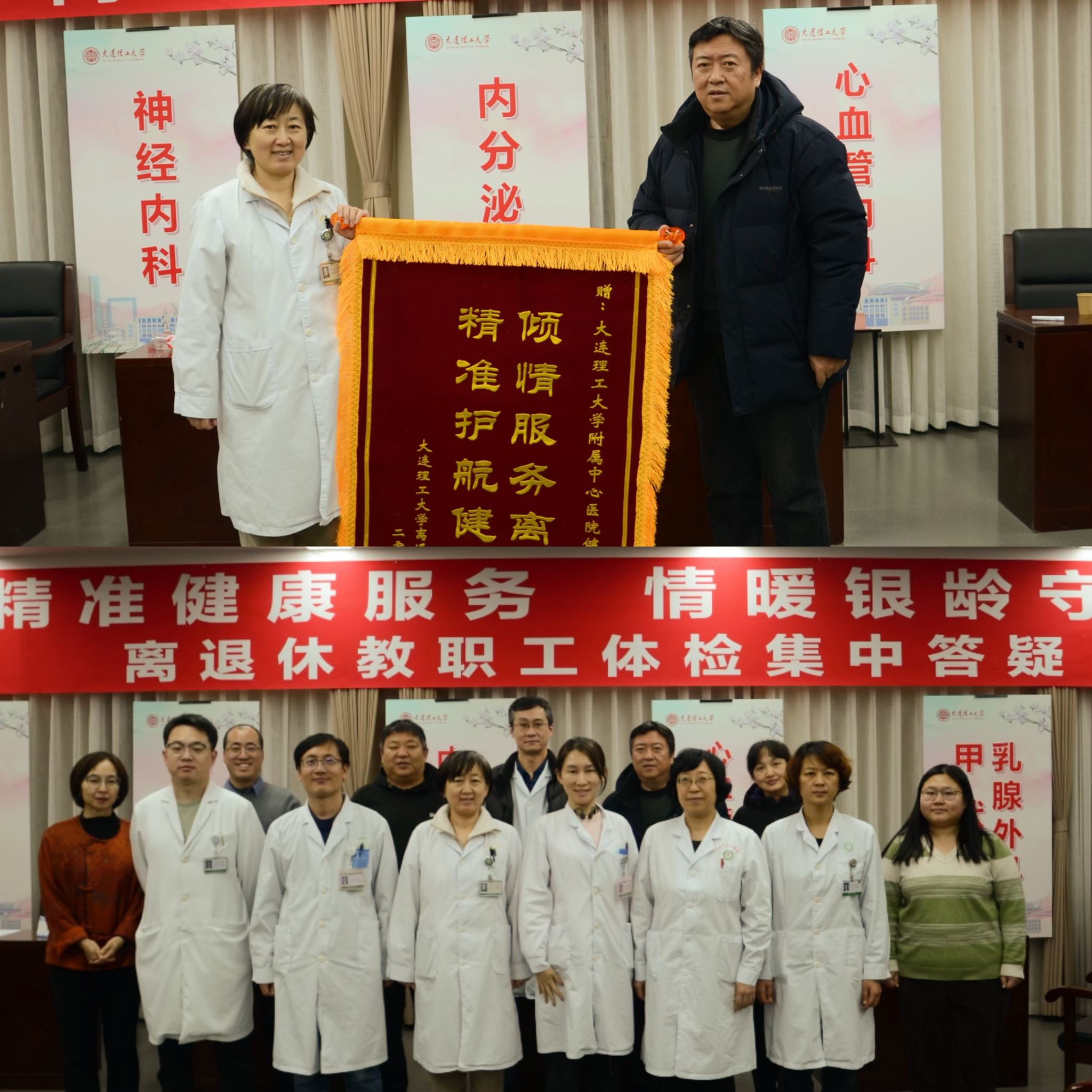 活动现场,离退休处处长兼党委书记刘宇彤向我校附属中心医院健康管理中心赠送了写有“倾情服务离退休 精准护航健康路”的锦旗。