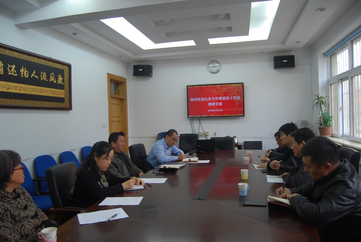 12月13日下午,离退休党委书记、处长刘宇彤,离退休党委副书记、副处长、纪委书记张程江及有关科室负责同志接待了前来调研的山东大学离退休工作处副书记、副处长王景山等一行4人,并进行了座谈交流。