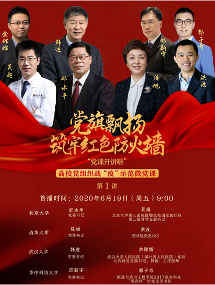 此次示范微党课由北京大学、清华大学、武汉大学、华中科技大学4校党委书记和基层党组织书记以“1+1”形式联合开讲。8位主讲人生动讲述了高校师生奋勇战“疫”的感人故事和深刻体会,传播抗“疫”精神,激发责任担当,让党旗始终在高校战“疫”工作中高高飘扬。
