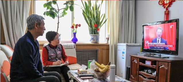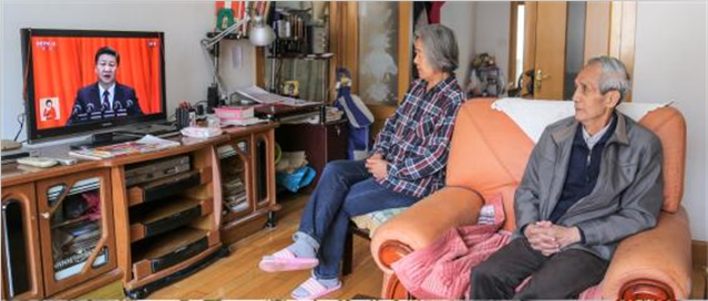 离退休党员在家中守在电视旁认真观看