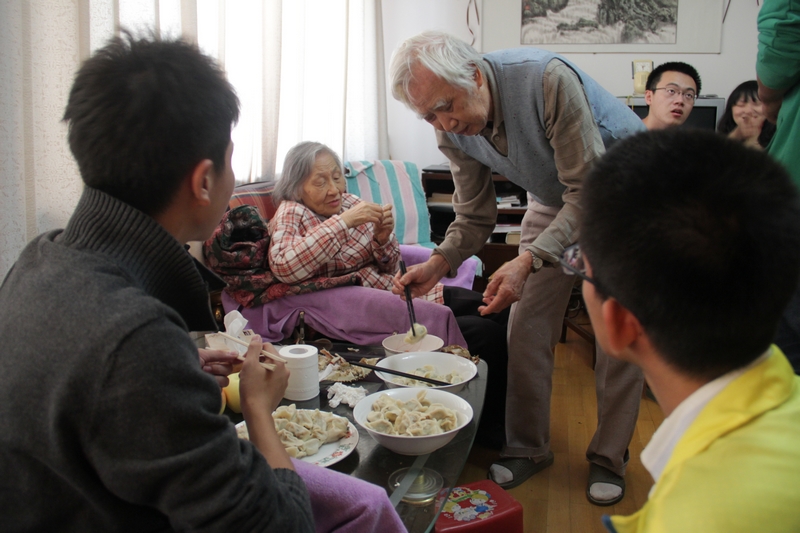大伙儿一起吃着饺子,坐在客厅聊着以前的故事,享受天伦之乐。18年的照顾,老人已经习惯了孩子们的陪伴,有什么要求也不再隐晦:“因为年纪大了,耳朵不好,有人敲门按门铃有时在卧室听不见,需要两个联动式门铃放在卧室”,志愿者们也欣然答应,表示下次看望老人时就带着过来。由于刘澍奶奶眼睛有病,不能长时间看书,奶奶所写的书校对就需要有人帮她一句一句地读,对此青协会长梁健向奶奶保证让志愿者来为奶奶读书。