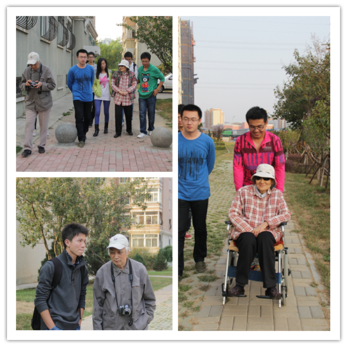吃完饺子后,奶奶提出要到小区里走走,志愿者们主动为爷爷奶奶拖地、洗碗,清理屋子。暗蓝色的天际夕阳西下,斑驳的树影躺在块块石头堆成的小道上,奶奶坐着轮椅,志愿者们轮流推着,爷爷脖子上挂着个相机,走在最前面时不时转过身来为奶奶和志愿者们拍张照片,构成一幅静谧而和谐的画面。重阳佳节的意义莫过于此,老有所安、病有所养,而年轻人们也有了敬老爱老的意识。