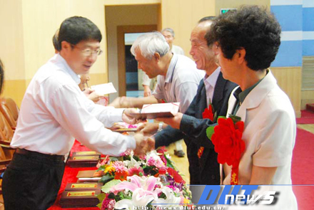 邵龙潭等向获表彰的先进单位代表及个人颁发了奖状和荣誉证书。 邵龙潭代表学校党委向全体离退休党员同志致以节日的祝贺,向受到表彰的先进党支部和优秀共产党员表示祝贺。邵龙潭向大家传达了校党委书记张德祥在学校庆祝建党90周年暨“两优两先”表彰大会上的讲话精神,他号召广大离退休党员向身边的先进学习,向身边的典型学习,从讲党性的高度贯彻落实党的决议、党的要求,在新的历史时期,加强学习,加强自身修养,努力做到“政治坚定,思想常新,理想永存”。