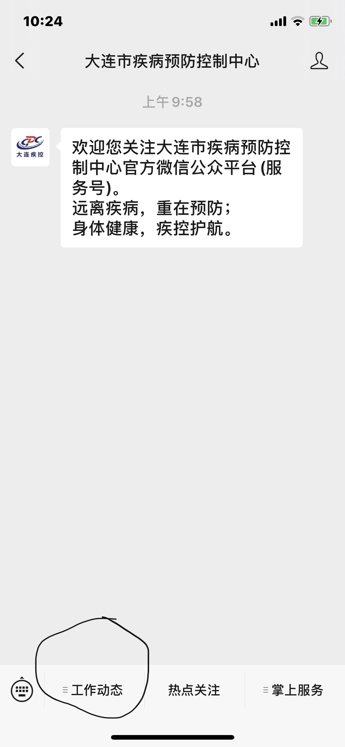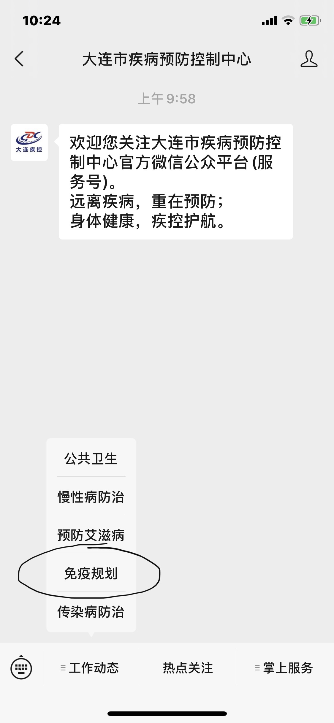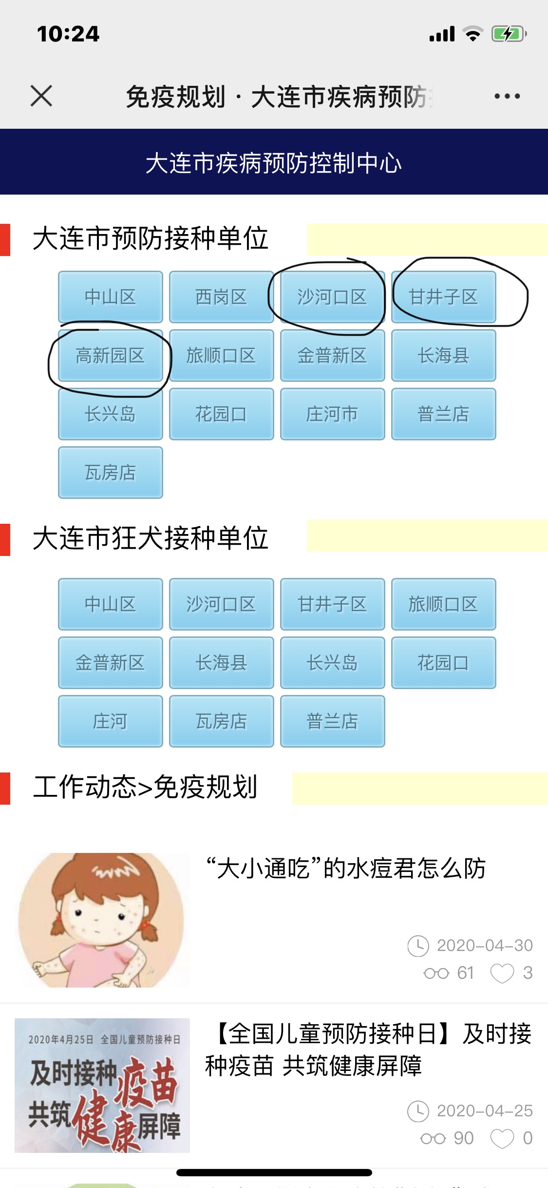 也可关注大连市疾病预防控制中心微信公众号,点击左下角“工作动态”后,选择“免疫规划”,就可查看大连市各区预防接种单位的地址、电话等相关信息。